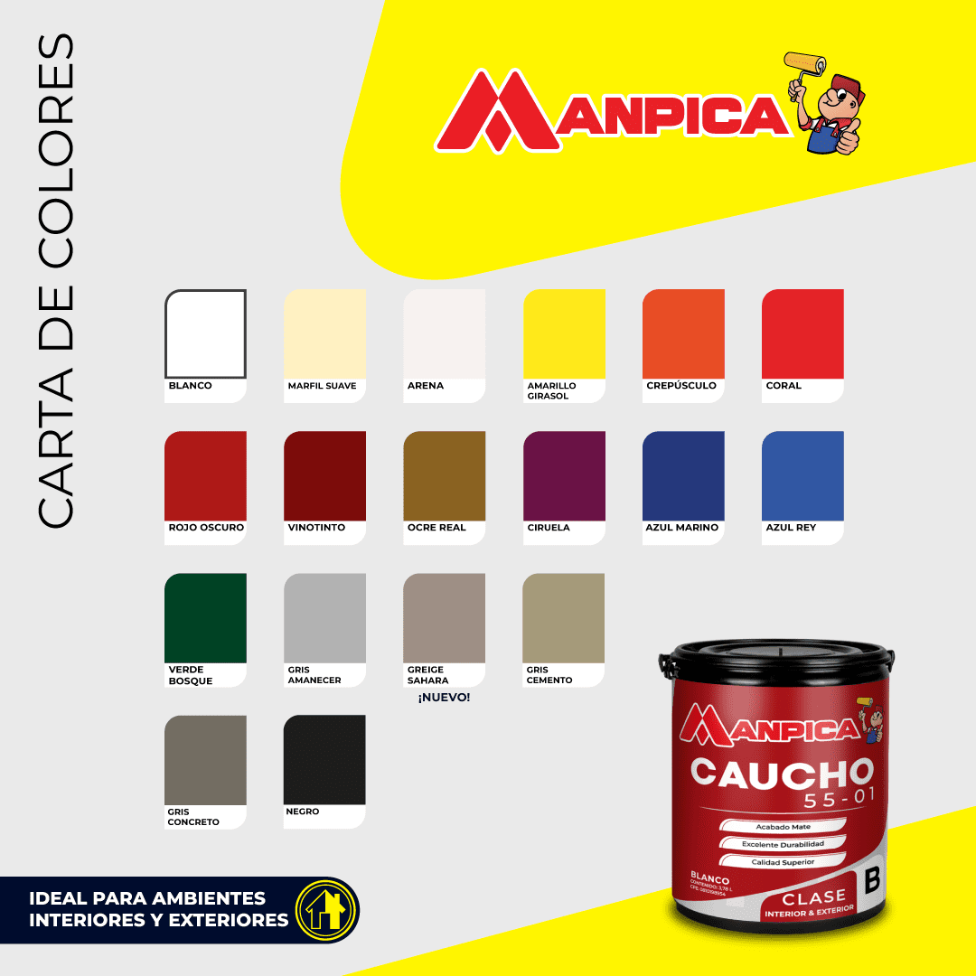Es una pintura de caucho con acabado mate clase “B”, ideal para ambientes interiores y exteriores. Puede ser aplicado sobre concreto, mampostería, madera, etc. Brinda un acabado con excelente durabilidad.